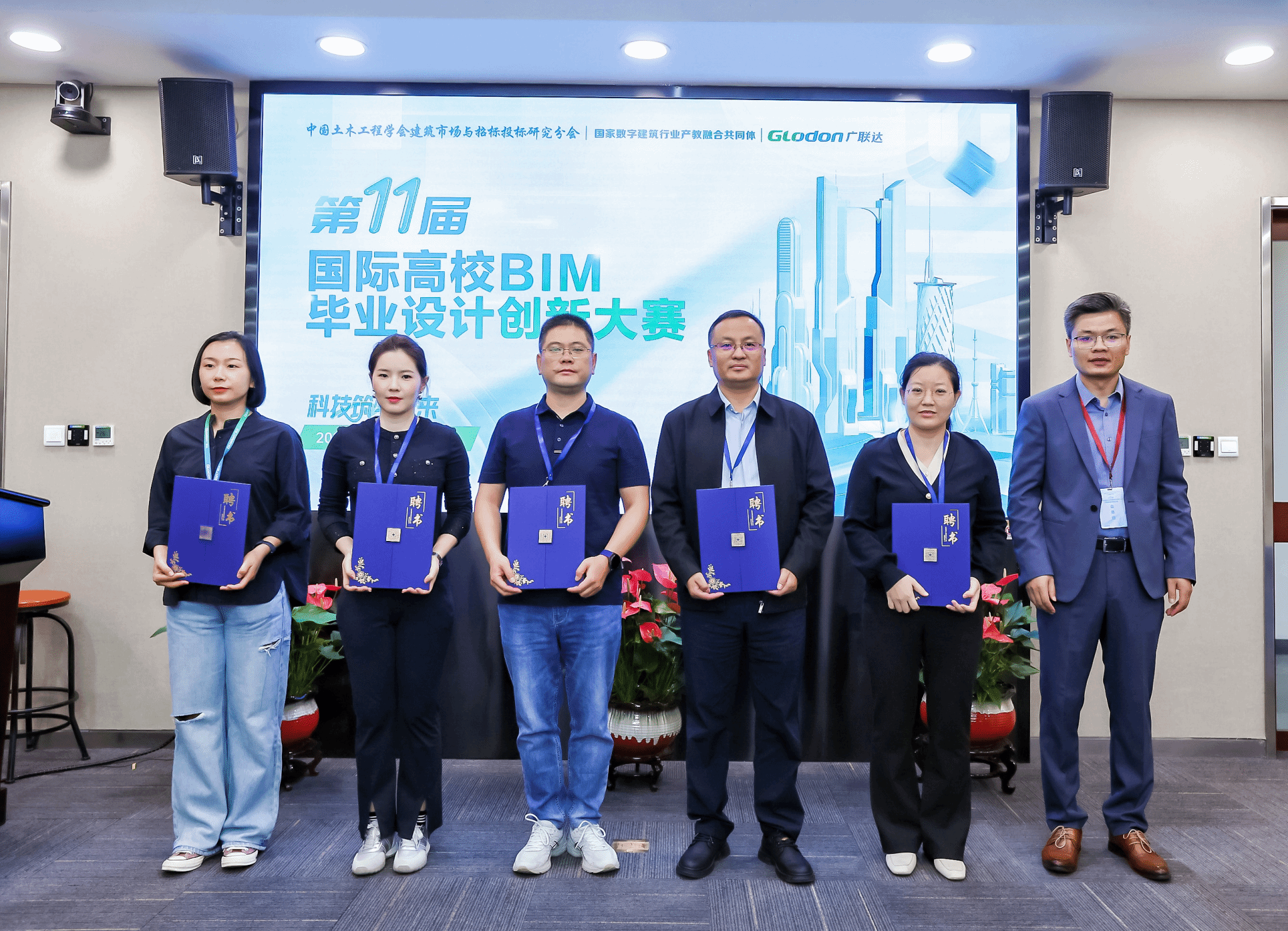 第十一届国际高校BIM毕业设计创新大赛负责人王嘉鑫女士邀请各赛项任务书专家上台,由广联达数字教育研究院院长樊志光为各位专家颁发大赛专家聘书并合影留念。