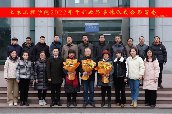 会议最后,青年教师代表向3位荣休的干部教师献花,最后全体参会老师在天工楼前一起合影留念。